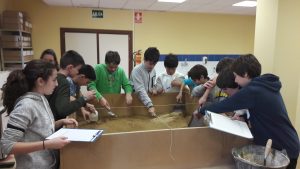 Al rato, pasamos a una sala con un par de mesas divididas en cuatro partes cada una de ellas. Allí, Héctor nos pidió que hiciésemos grupos de tres personas y a cada grupo se le asignó una zona en las que estaba dividida la mesa. Las funciones que teníamos que hacer eran las siguientes: uno del grupo se encargaba de excavar, encontrar y limpiar los objetos, otro se encargaba de dibujarlos y el otro miembro del grupo embolsaba los objetos y los clasificaba.