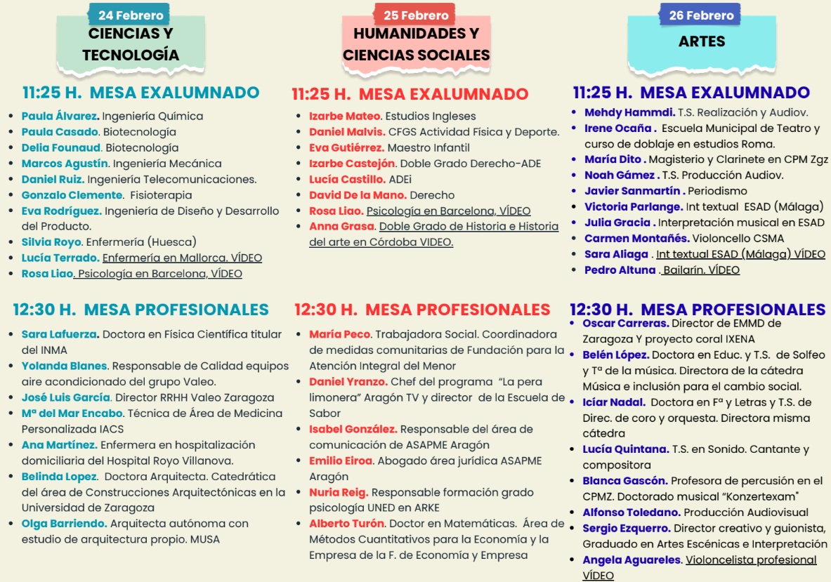 Cada día habrá dos mesas redondas, una de exalumnado a las 11:25 y otra de profesionales, a las 12:30. A estas mesas podrá asistir el alumnado de 1º y 2º de Bachillerato de cada modalidad.