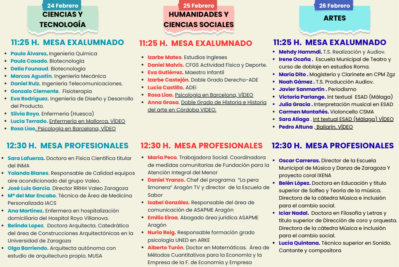 Cada día habrá dos mesas redondas, una de exalumnado a las 11:25 y otra de profesionales, a las 12:30. A estas mesas podrá asistir el alumnado de 1º y 2º de Bachillerato de cada modalidad.